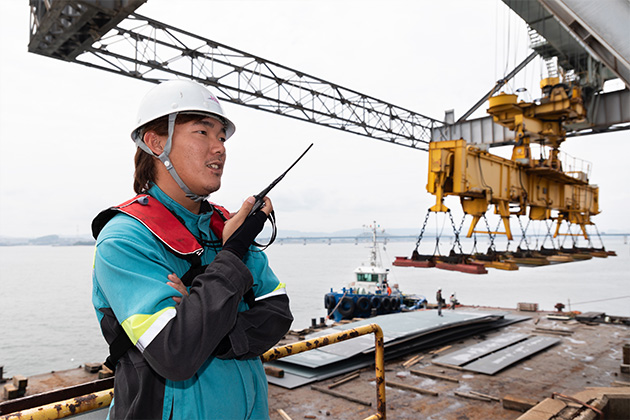 外航船の運航計画の立案や調整、運航状況の管理などを行っています。事務所でのデスクワークと現場での作業が半々。事務所では、パソコンで輸出入書類の作成や配信を行います。翌週の予定を組む作業は、天候にも左右され、スムーズにいかないことも多いですが、経験を積みながら身につけている最中です。外国人の船長とやり取りするため、英語力も必要になります。現場での作業は、船が入港する際の綱取りなど体力のいる仕事。安全確認と体調管理に気をつけて作業しています。